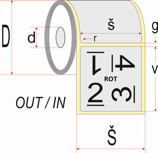 - Zákazník pri objednávke špecifikuje požadované technické materiálové a rozmerové parametre etikety, parametre rotácie a návinu etikety spravidla v milimetroch, podľa obrázka - najmä výška etikety = v, šírka = š, šírka kotúča = Š, priemer dutinky = d, priemer kotúča = D, medzera medzi etiketami = g, zaoblenie rohov = r, rotácia etikety = ROT, vonkajší OUT, alebo vnútorný IN návin etikiet a počet kusov na kotúči (ks/kot). U termotransferových pások obdobne. Rozmerové tolerancie jednotlivých parametrov sú štandardne: +- 0.1mm výsek samotných etikiet (telo etikety), +- 1.0mm nosný pás / rezanie a porciovanie / parametre dutiniek a ostatné parametre. Ak zákazník niektorý z parametrov neuvedie, predajca má za to že tento parameter môže prispôsobiť svojim možnostiam alebo bežným štandardom.